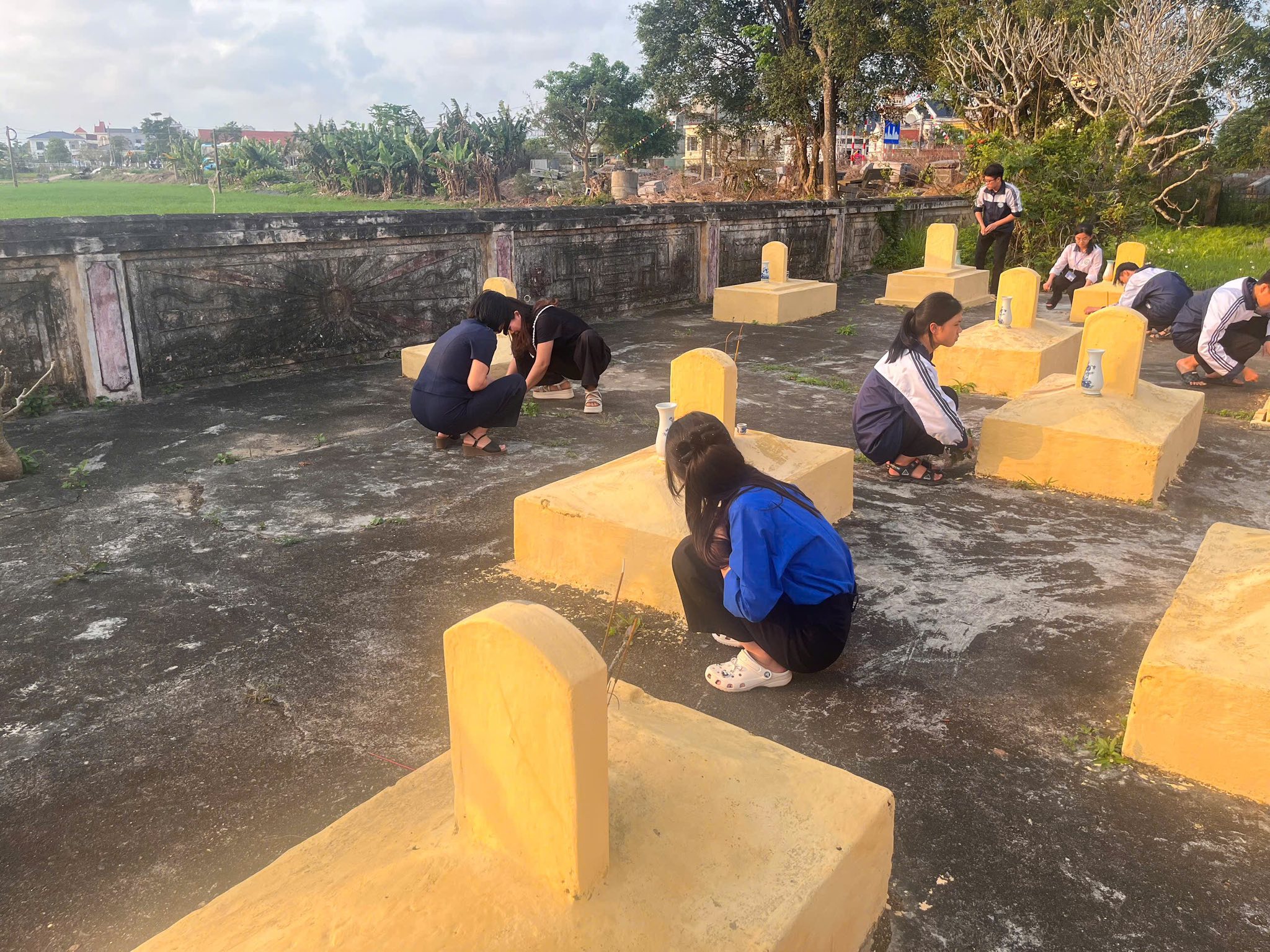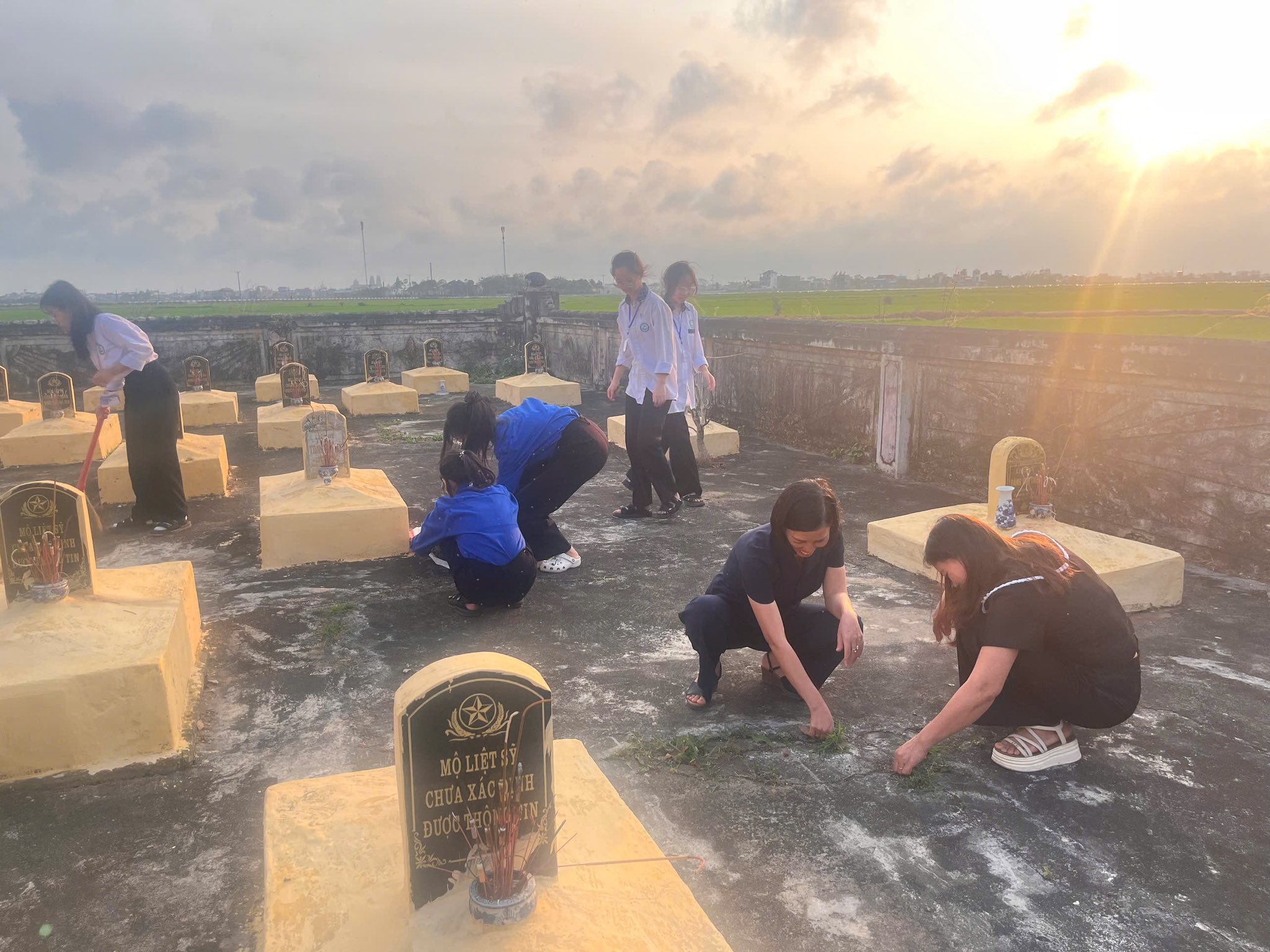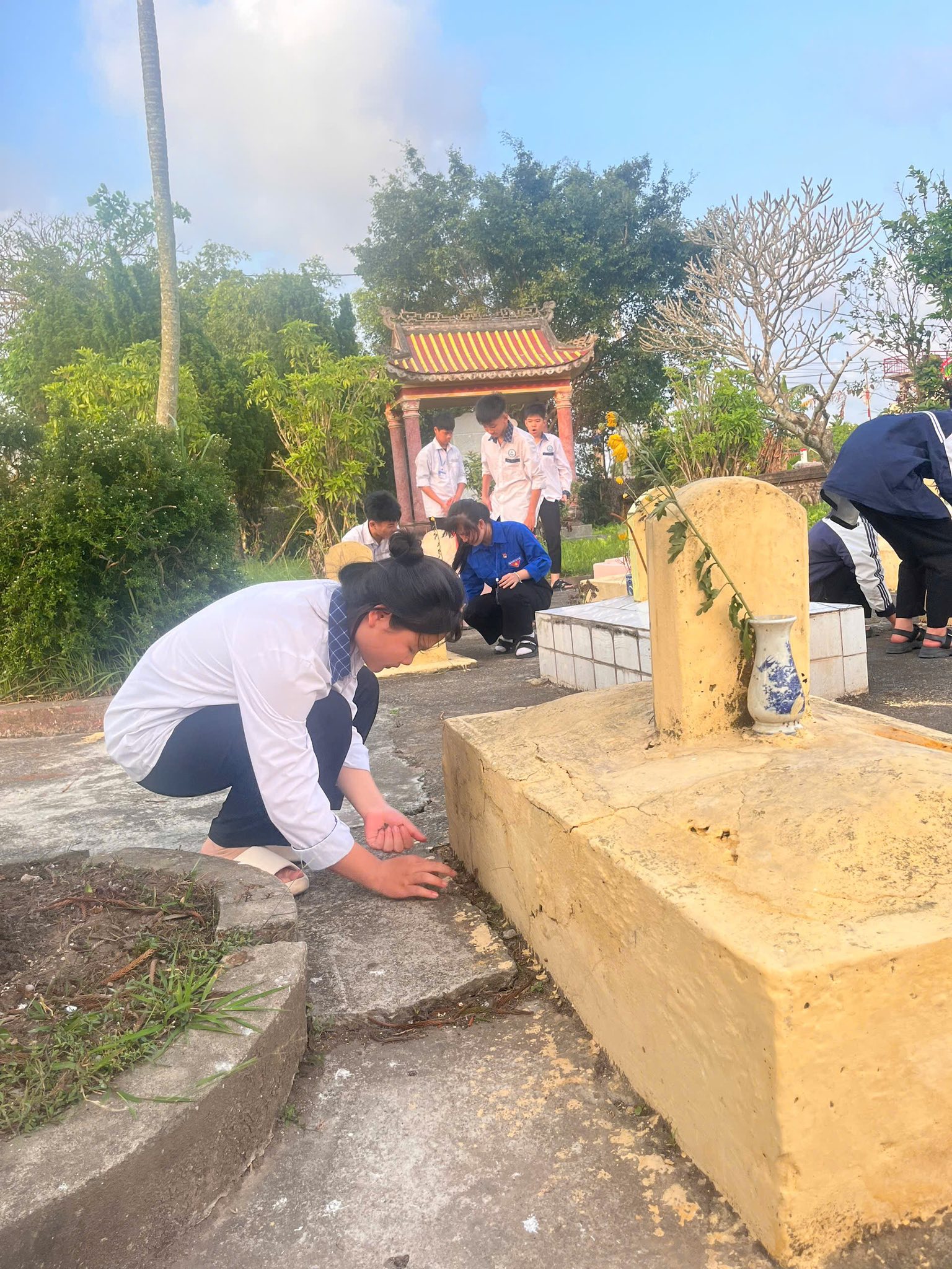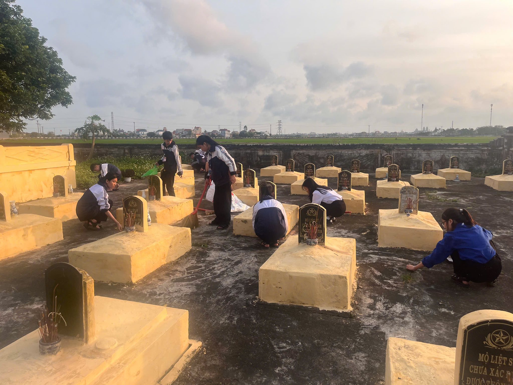 Không chỉ dừng lại ở lễ viếng, các tân Đoàn viên đã cùng nhau ra quân chăm sóc, chỉnh trang và làm đẹp cho các phần mộ liệt sĩ. Những bàn tay trẻ trung, nhiệt huyết của các em nâng niu từng nhành hoa, lau dọn từng khuôn viên, như một lời hứa sắt son: “Sống, học tập và rèn luyện sao cho xứng đáng với sự hy sinh của thế hệ cha anh đi trước.”