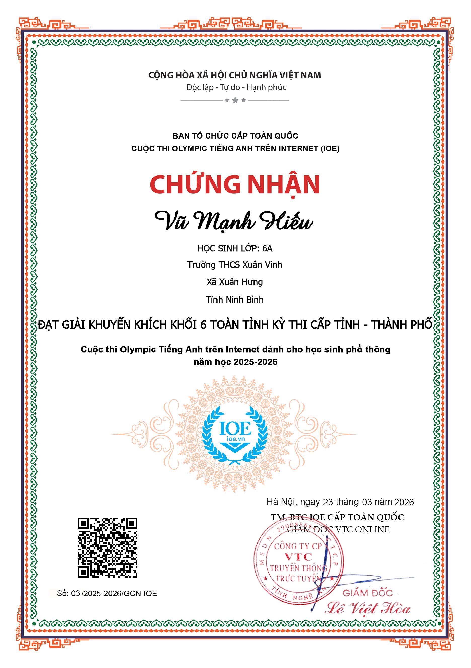 7. Em Vũ Mạnh Hiếu (Khối 6) – Đạt Giải Khuyến khích.