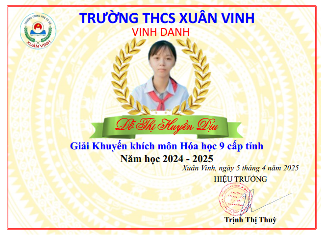 Nhà trường xin chúc mừng và tuyên dương các em học sinh đã tham gia kỳ thi Học sinh giỏi cấp Tỉnh (năm học 2024-2025). Với sự nỗ lực không ngừng, các em đã mang về những thành tích rực rỡ, góp phần làm rạng danh nhà trường, phát huy truyền thống hiếu học của quê hương Xuân Vinh. Nhà trường hy vọng rằng thành công của các em sẽ là nguồn cảm hứng, động lực để các bạn học sinh khác tiếp tục phấn đấu, chinh phục những đỉnh cao tri thức.